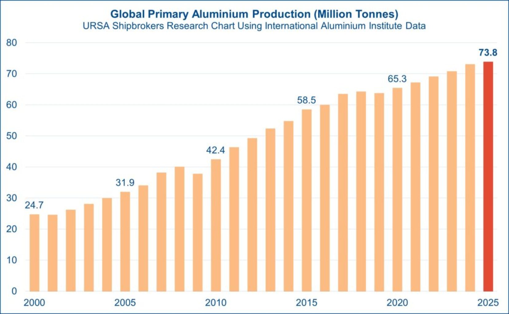Prema analizi Ursa Shipbrokersa, temeljenoj na podacima Međunarodnog instituta za aluminij, svjetska proizvodnja primarnog aluminija u 2025. godini dosegla je 73,8 milijuna tona, što je rast od 1,1 posto u odnosu na prethodnu godinu. U usporedbi s 2000. godinom, riječ je o povećanju od čak 199 posto, što jasno pokazuje koliko je aluminij postao ključan u brodogradnji, prometu, građevinarstvu, energetici i širokoj potrošnji, navodi Splash247.
