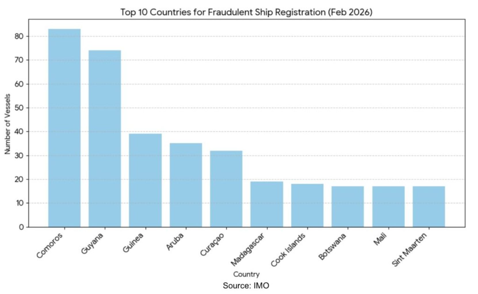 Timor-Leste i Lesoto obavijestili su IMO da uopće ne vode međunarodne registre, nakon što su se pojavile krivotvorene potvrde. Ujedinjeno Kraljevstvo upozorilo je na zlouporabu MMSI brojeva Bermude. Benin i Gambija proveli su čišćenje registra, pri čemu je Gambija uklonila 72 broda i uvela moratorij na nove upise.