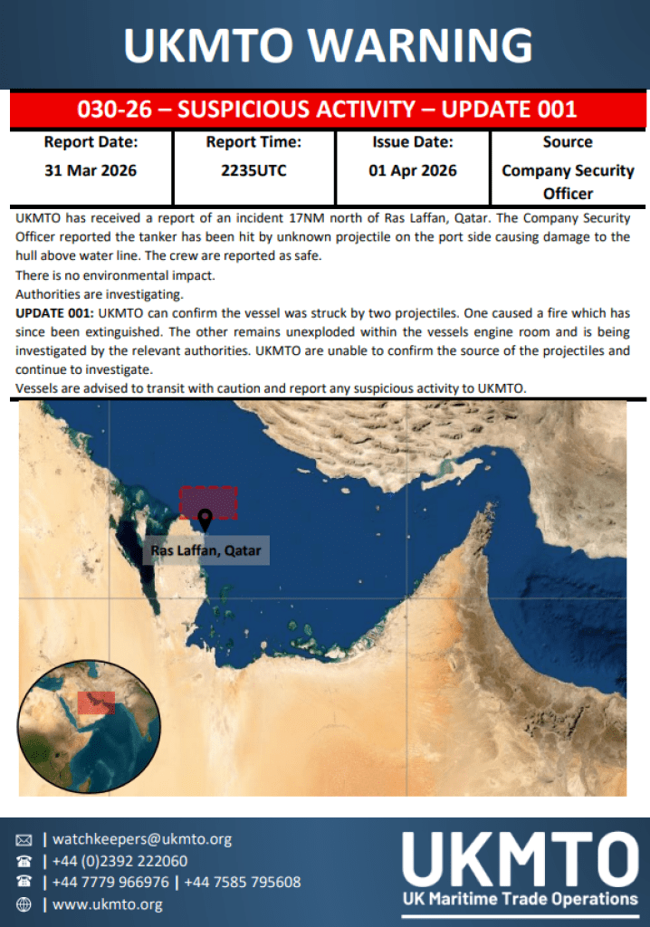 LNG tanker koji je plovio oko 17 nautičkih milja sjeverno od Dohe pogođen je s dva projektila, a jedan od njih nije eksplodirao i nalazi se unutar broda.