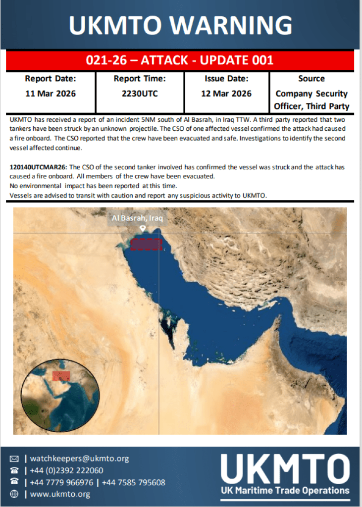 Dva tankera zahvaćena su požarom u Perzijskom zaljevu nakon što su pogođena nepoznatim projektilima u blizini iračke luke Basra, objavila je britanska služba UK Maritime Trade Operations (UKMTO).